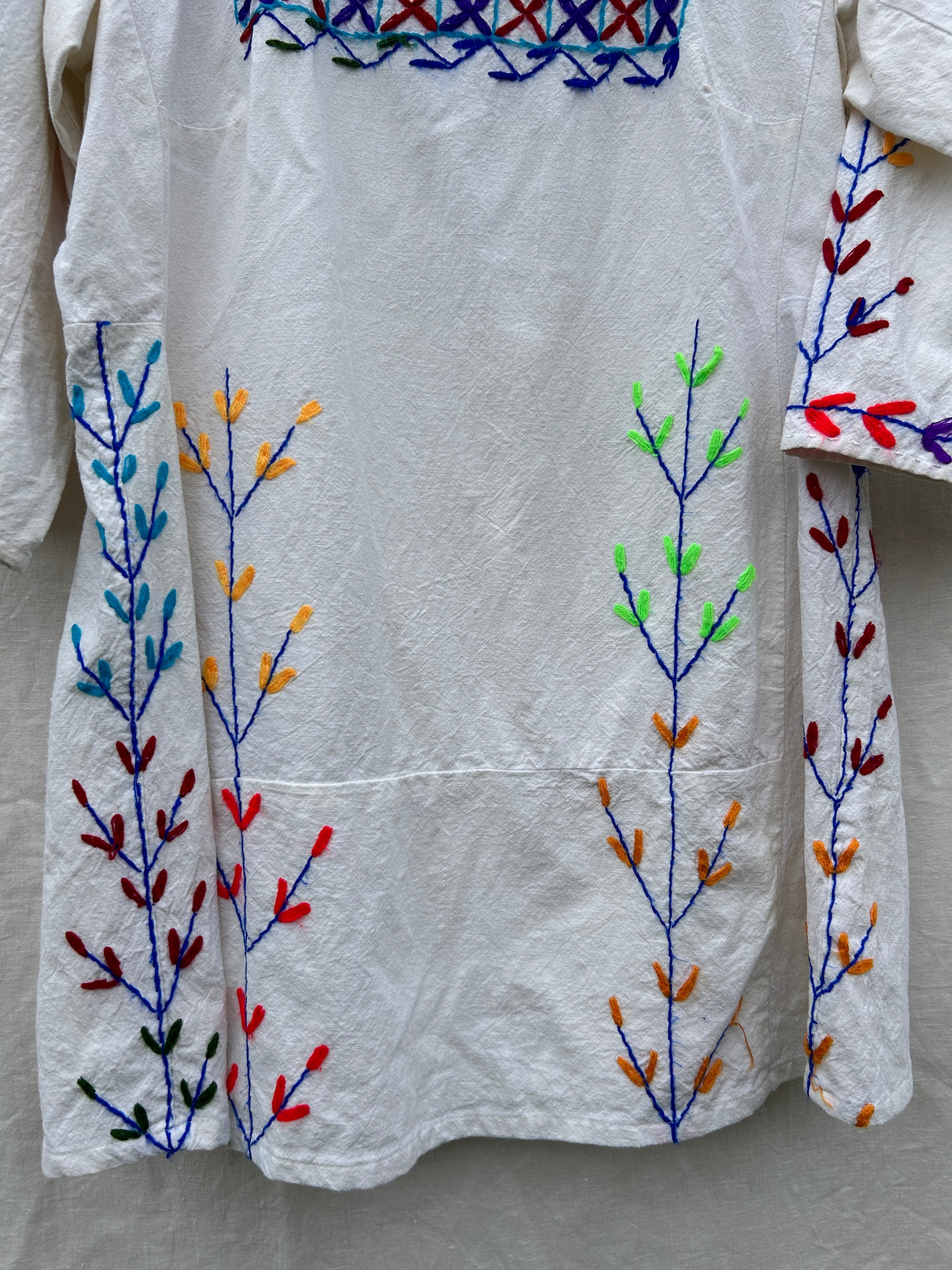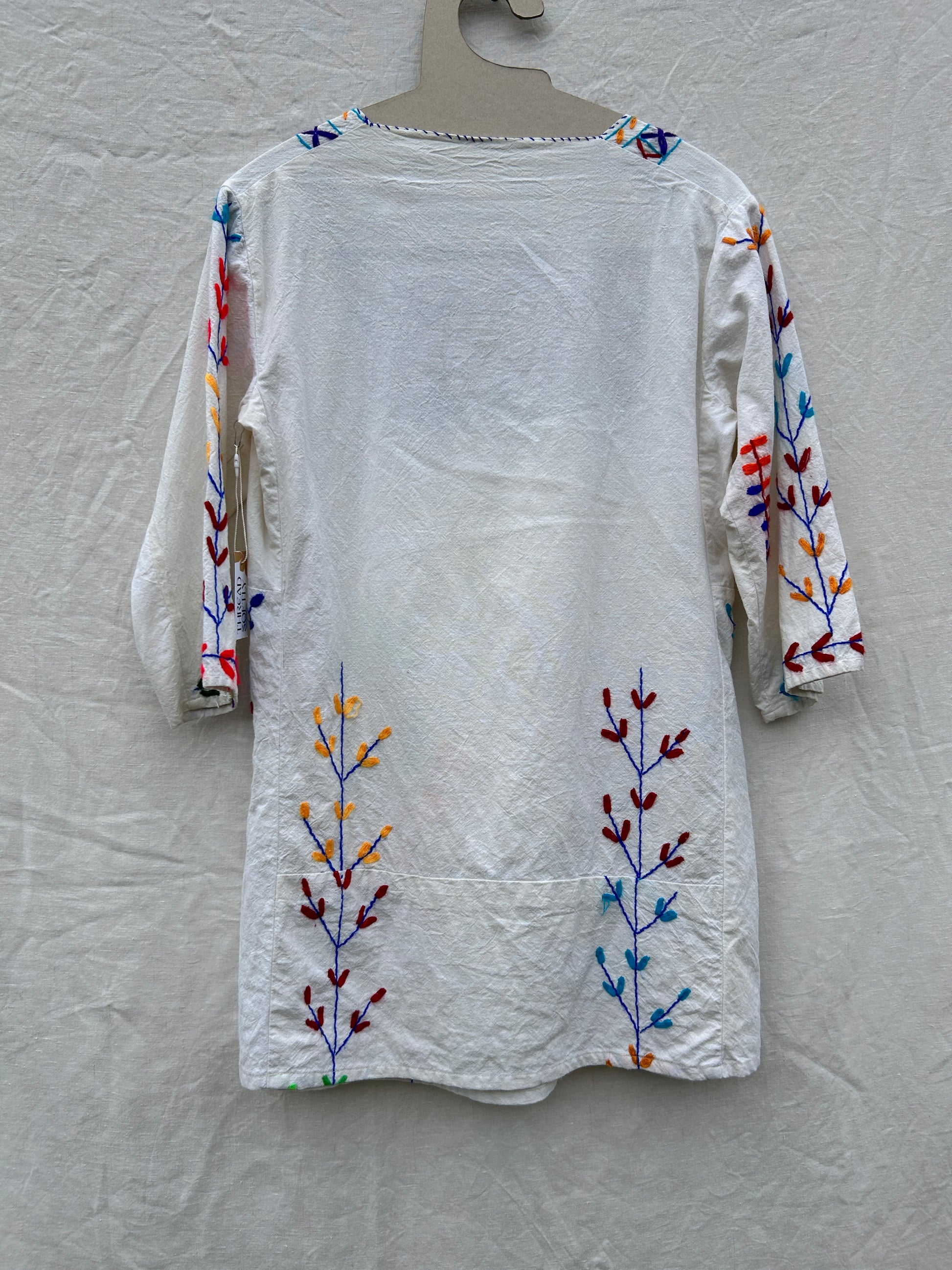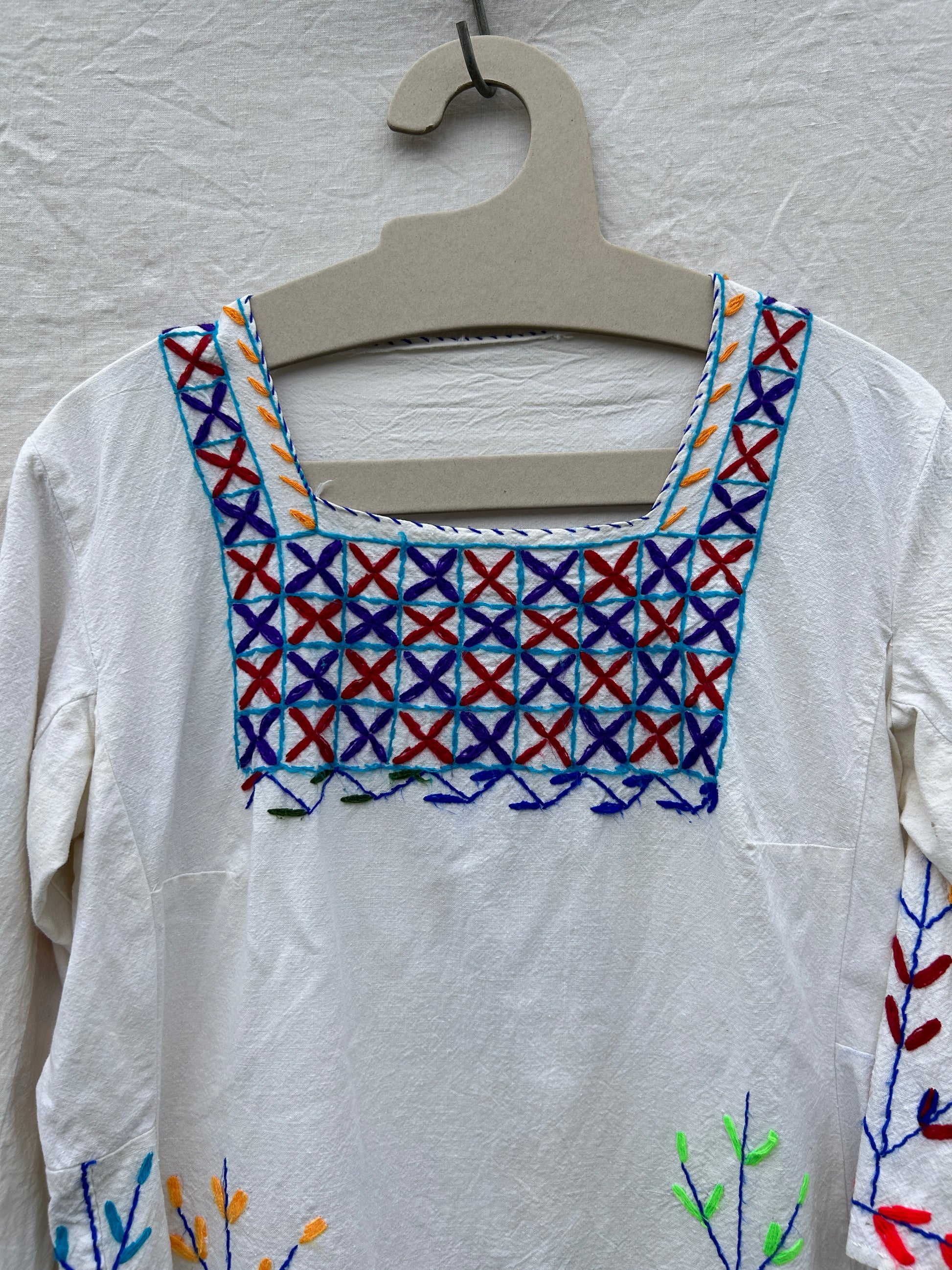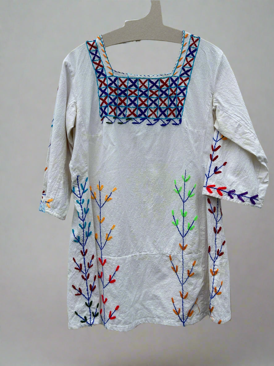 Vintage mini dress or use it as a top with 3/4 sleeves. Features colorful embroidery throughout the dress.